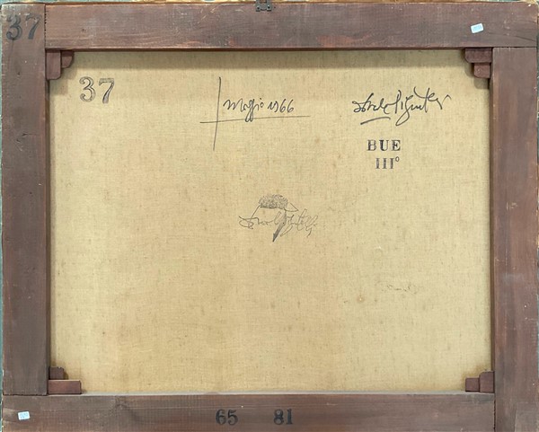 firma a timbro blu in basso al centro; firmata e iscritta al verso (difetti)