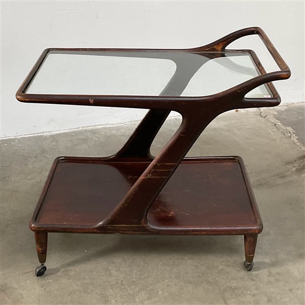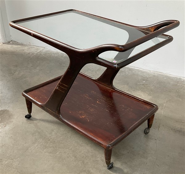 Carrello portavivande a due ripiani, legno scuro massello, piano superiore in cristallo. Italia, anni '50. (cm 77x71x47,5) (difetti)