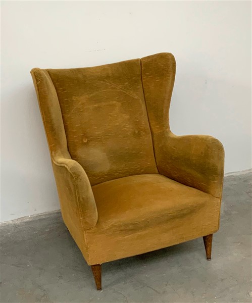 Bergere imbottita rivestita in velluto beige con piedini troncoconici in legno. Italia, anni '40. (cm 77x93x66) (difetti e mancanze)