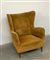 Bergere imbottita rivestita in velluto beige con piedini troncoconici in legno.