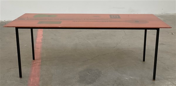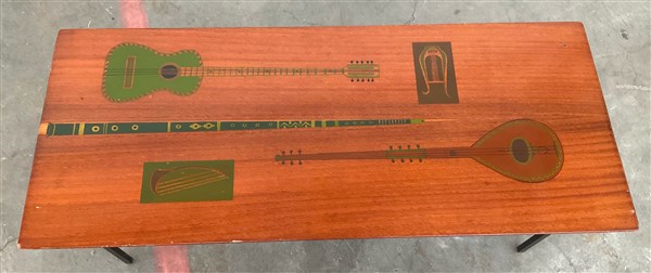 Tavolino da salotto con sostegni in metallo e piano in legno con decoro a strumenti musicali. Italia, secolo XX. (cm 110x41x46) (lievi difetti)