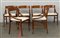 Gruppo di sei sedie in legno con schienale a giorno, seduta in similpelle bianca. Italia, anni '70. (cm 50x77x45) (lievi difetti)