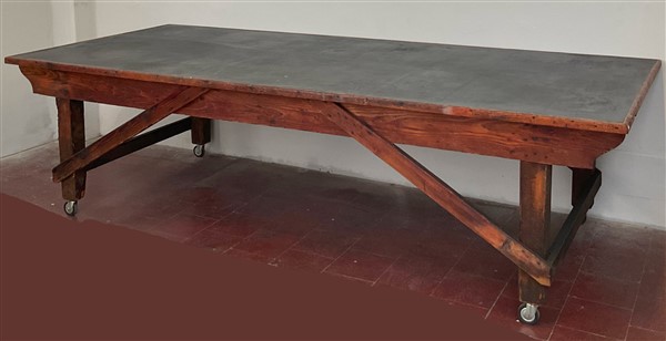 Tavolo da lavoro in legno di castagno, gambe munite di rotelle e piano con inserto in gomma. Italia, secolo XX. (cm 303x85x129) (difetti)