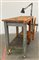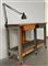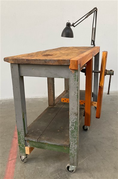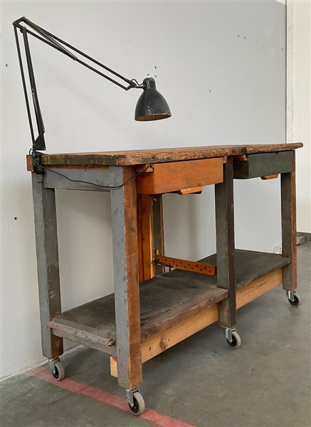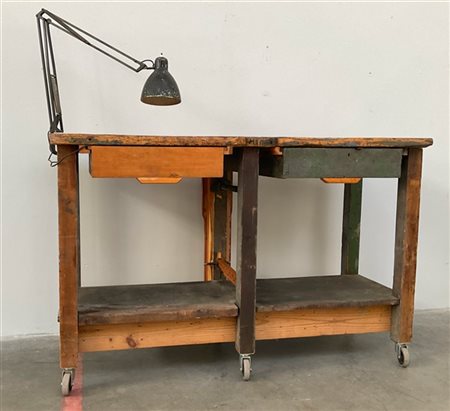 Tavolo da lavoro con rotelle, due cassetti in legno parzialmente dipinto, morsa da falegname e lampada snodabile Naska Loris. Italia, seconda metà secolo XX. (cm 148x96x60) (difetti)