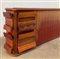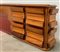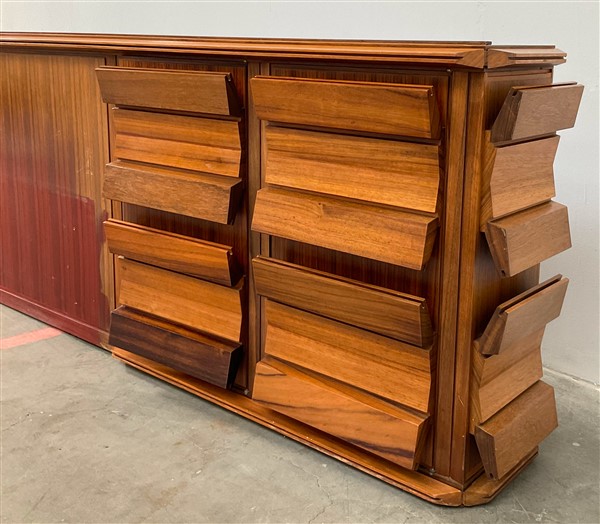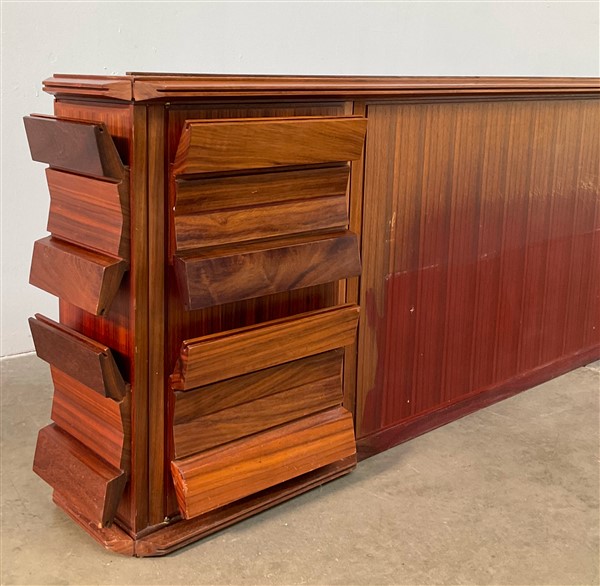 Testata da letto a tre ante in legno con maniglie di forma sagomata come sui fianchi. (cm 344x76x31) (difetti e mancanze)
