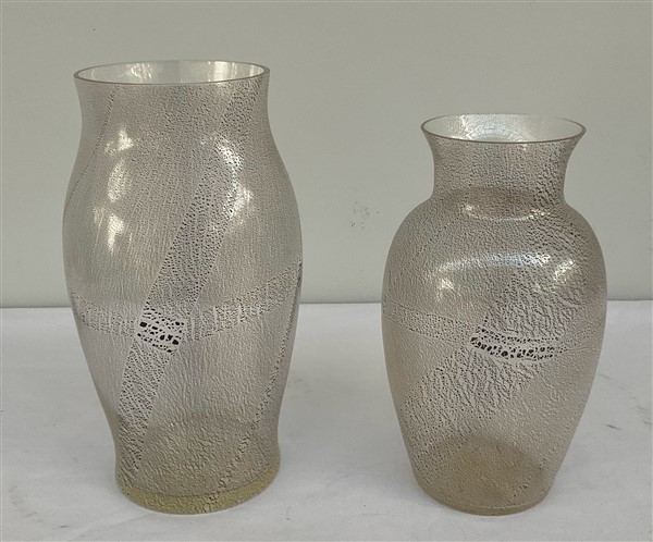 Due vasi in vetro trasparente incolore con applicazione di foglia d'argento. Italia, secolo XX. (h max cm 30)