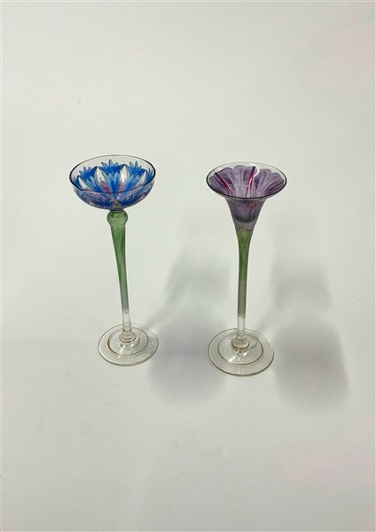 Lotto di due piccoli calici in vetro soffiato con fusti e coppe dipinti e motivi floreali. (h cm 16,5) (difetti)