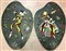 Coppia di plannelli sagomati in trucciolare decorati a mosaico di specchi colorati con figure di Arlecchino e Colombina. Francia, metà secolo XX. (cm 71x115) (difetti e mancanze)