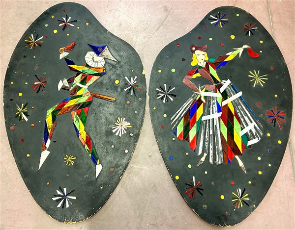 Coppia di plannelli sagomati in trucciolare decorati a mosaico di specchi colorati con figure di Arlecchino e Colombina. Francia, metà secolo XX. (cm 71x115) (difetti e mancanze)