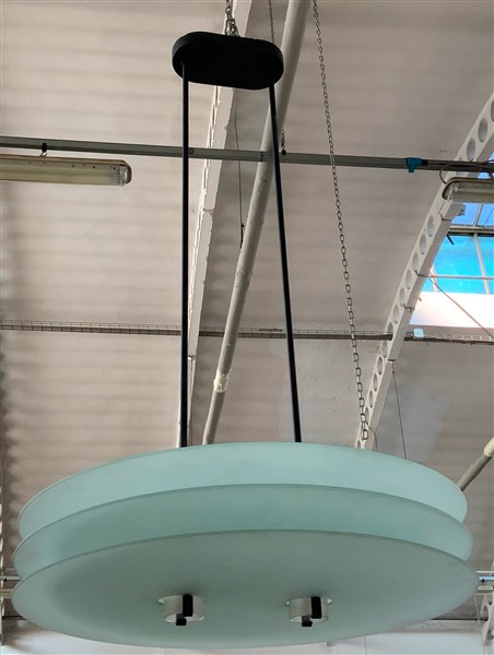 Lampada a sospensione modello "Vega/Venus". Produzione Quattrifolio, Italia, anni '80. Struttura in metallo laccato nero, tre dischi in vetro smerigliato. (h cm 123; d cm 70) (difetti)
