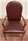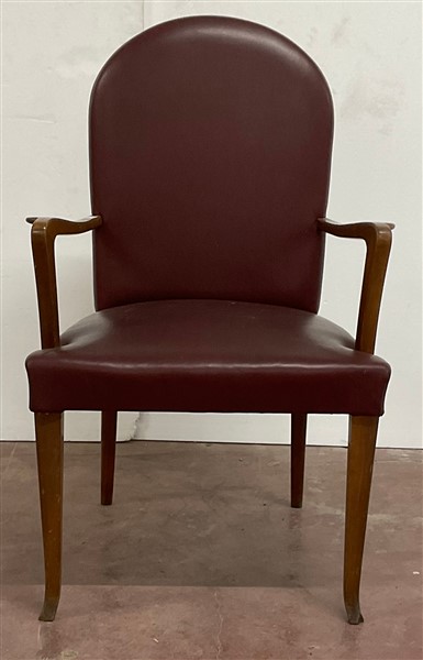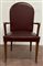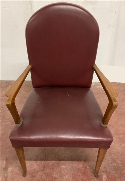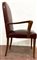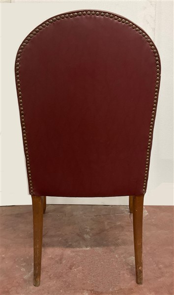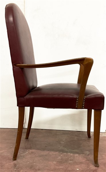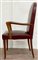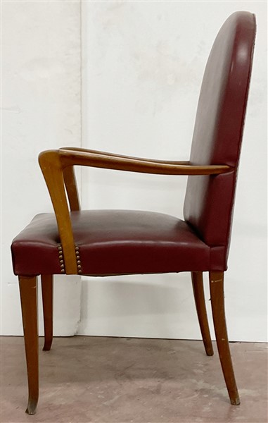 Poltrona con struttura in legno, braccioli sagomati, seduta e schienale rivestiti in similpelle bordeaux borchiato. Italia, anni '40/'50. (cm 63x103x55)
