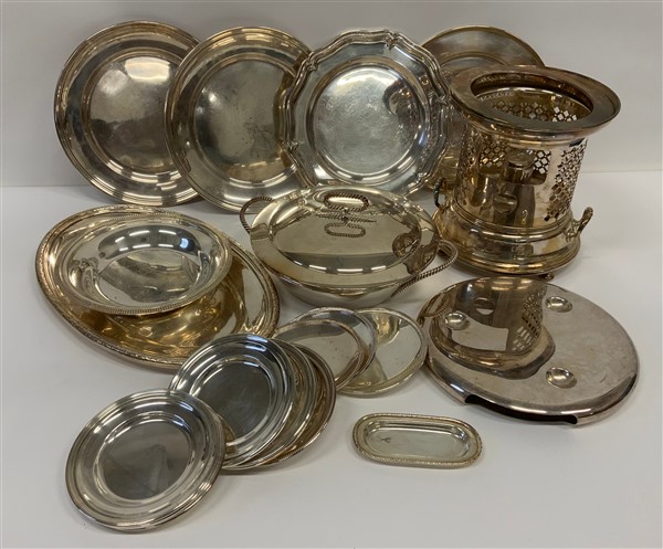 Lotto di due cartoni contenenti numerosi oggetti per la tavola in metallo argentato di manifatture differenti. Secolo XX. (difetti)