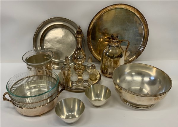 Lotto 795 | Lotto di due cartoni contenenti numerosi oggetti per la tavola in metallo argen