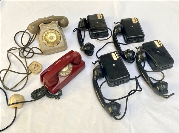 Lotto composto da due telefoni a disco da tavolo e quattro apparecchi telefonici da parete per centralino in materiale plastico. (difetti)
