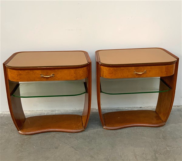 Coppia di comodini in legno ad un cassetto con piani in vetro di cui quello superiore retroverniciato. Italia, anni '50. (cm 55x51x33) (lievi difetti)