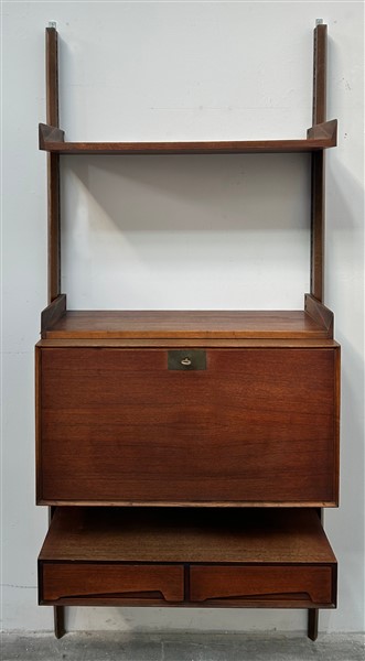 Libreria pensile in legno massello e impiallacciato modulare con cassetti, ribalta e due ripiani. Produzione Dassi, Italia, anni '50. (cm 80x196x41)