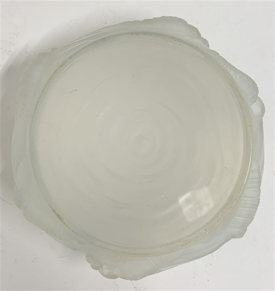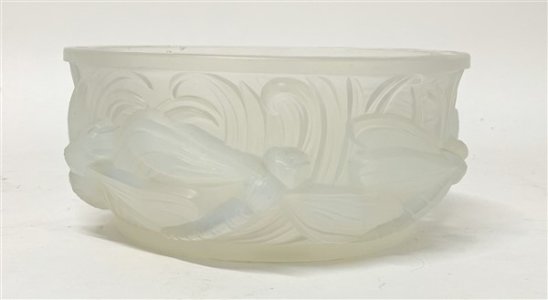 Coppa in vetro opalescente pressato in forma circolare con rilievi a libellule. Verlys, Francia, inizio secolo XX. Firma in rilievo al centro. (d cm 25) (difetti)