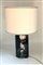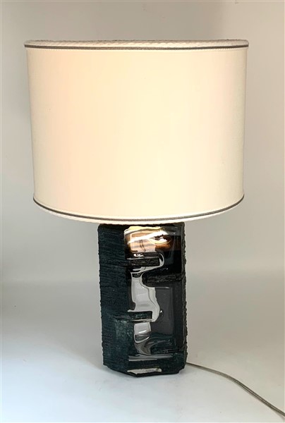 Lampada da tavolo modello "Argos". Esecuzione Daum, Francia, anni '70. Base in vetro stampato trasparente e acidato con paralume in stoffa. (h cm 57)