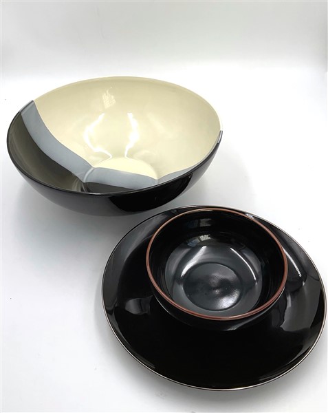 Lotto composto da un centrotavola, un piatto e una ciotola in ceramica smaltata. Anni 2000. Marcati sotto la base. (d max cm 35) (lievi difetti)