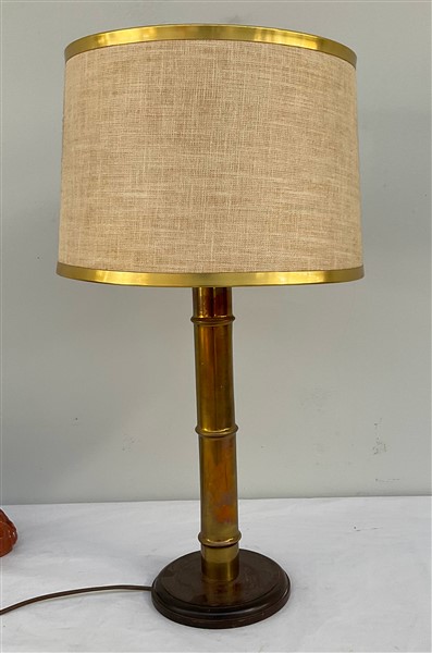Lampada da tavolo in metallo dorato a finto bambù, base in legno e paralume in