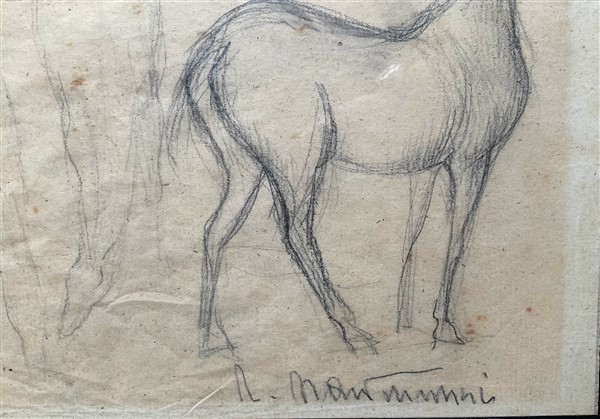 Due studi a matita su carta raffiguranti cavalli e uomini assisi, firmati in basso a destra (misure diverse, h max cm 21.5) in cornici. (difetti)