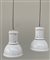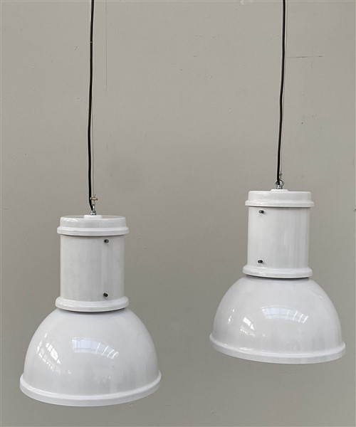 Coppia di lampade a sospensione modello "Lampara". Milano, 1965. Alluminio laccato bianco. (d cm 33) (lievi difetti)