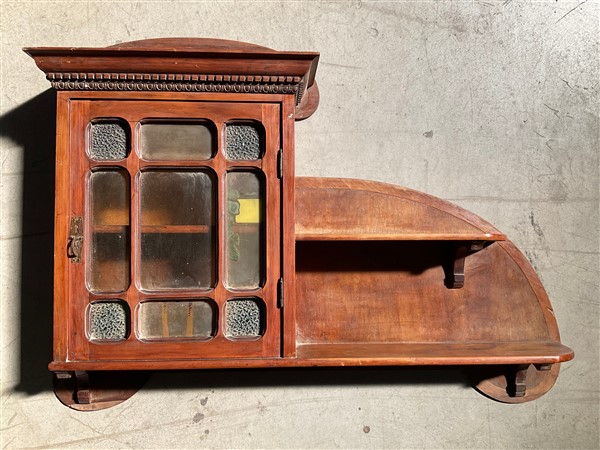 Armadietto pensile Liberty in legno massello con un'anta a vetri trasparenti colorati e due piccole mensole a giorno. Italia, 1900ca. (difetti)