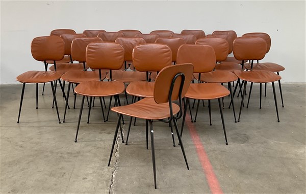 Gruppo di ventidue sedie con struttura in tondino metallico e rivestimenti in similpelle marrone. Italia, anni '60. (cm 46x84x52) (difetti)