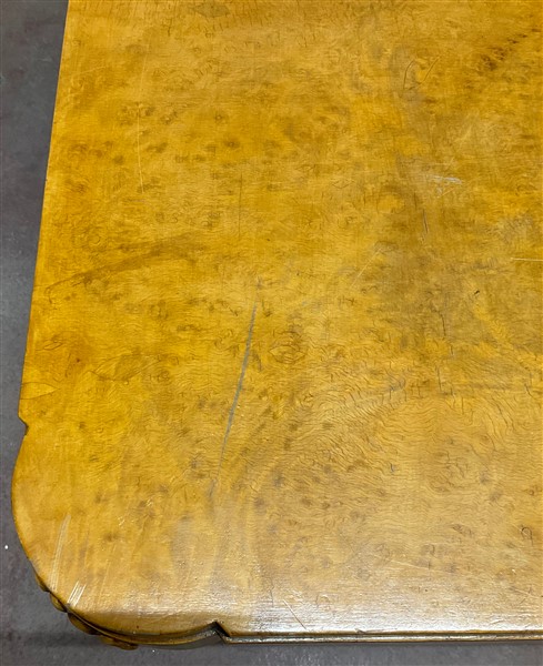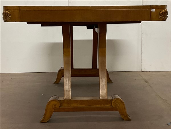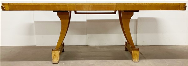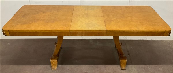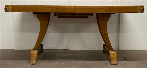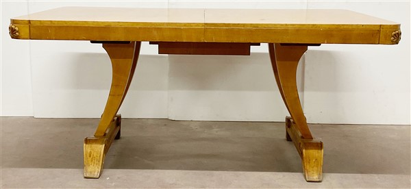 Hille, Inghilterra 1930 ca. Tavolo allungabile lastronato in acero con montanti curvi e piedi sagomati, decorato con intagli a ventaglio sugli angoli (cm 168x78x91) (tavolo analogo venduto da Sotheby's Londra, Giugno 2004). (difetti)
