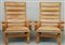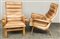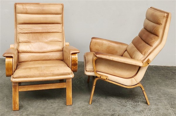 Coppia di poltrone con struttura in faggio curvato, rivestimento in pelle beige. Produzione svedese, anni '70 del sec. XX (cm 76x100x87)