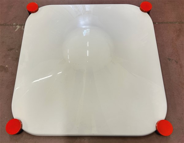 Lampada modello "Bolla". Produzione Martinelli Luce, Italia, anni '70. Metallo verniciato bianco, alluminio tornito e metacrilato opalino. (cm 86,5x86,5) (lievi difetti)
