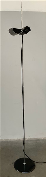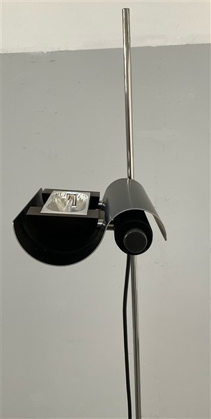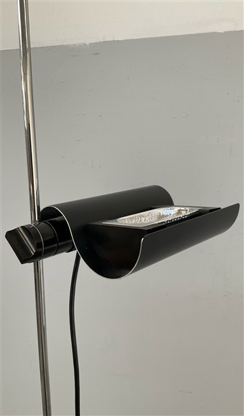 Lampada da terra modello "DM 333". Produzione O-Luce, Milano, anni '70. Base e paralume in metallo nero, struttura in metallo cromato. (h cm 200)