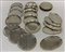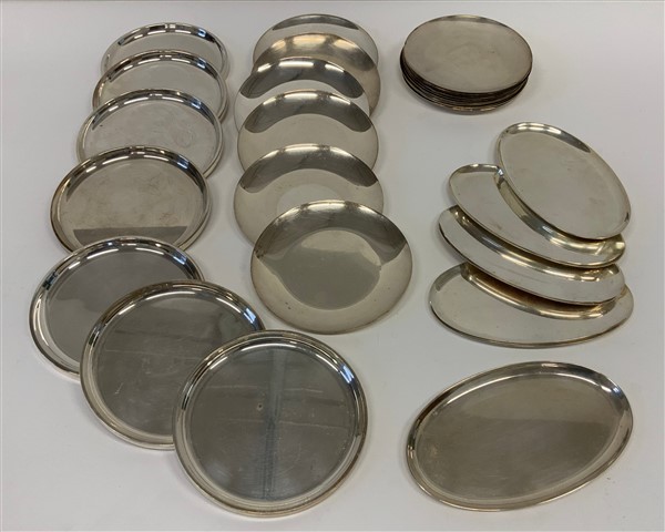 Lotto di trenta piccoli vassoi e sottobottiglie in metallo argentato di forme differenti. Bregnano, seconda metà secolo XX. Metallo argentato. (piccoli vassoi cm 10,5x18; sottobottiglie cm d 14)