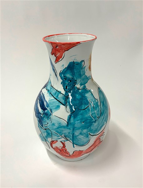 Vaso in terracotta dipinta in policromia. Manifattura Ceramiche San Giorgio, Albissola, 2008. Firmato e datato alla base, titolo e firma della manifattura sotto la base. (h cm 43)