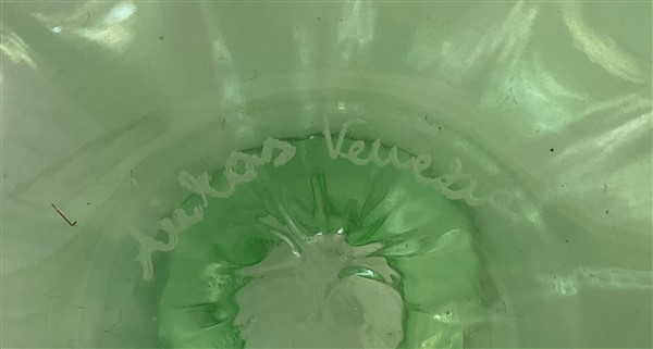 Gruppo di tre vasi in vetro trasparente verde. Venezia, secolo XX. Firmati a punta. (h max cm 18) (difetti)