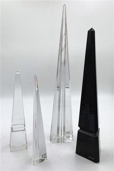 Lotto di quattro obelischi in cristallo incolore trasparente e nero. Francia, seconda metà secolo XX. Marcati e firmati alla base. (h max cm 45,5)