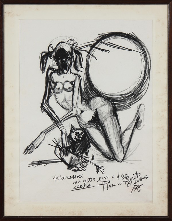 ANONIMO Psiconevrosi con gatto nero e fiori. 1976. Carboncino su carta. Cm 40,00 x 54,00. Titolo, firma e anno in basso a destra. Cornice presente