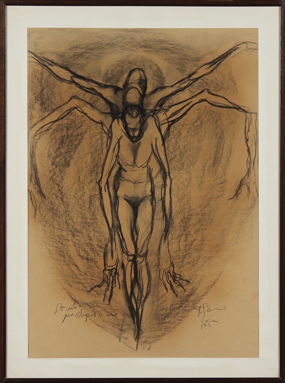 ANONIMO Studio per deposizione. 1975. Carboncino su carta. Cm 50,00 x 70,00. Firma T.Severino. Cornice presente