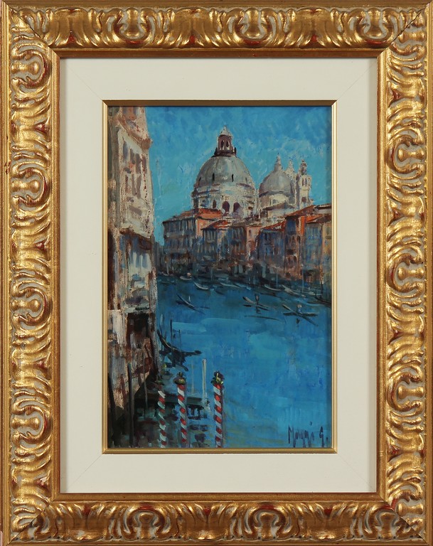 MAGGI GIAMPIETRO (n. 1934) Venezia, la Salute. Tecnica mista su cartone telato. Cm 20,00 x 30,00. Firma in basso a destra. Al retro firma e titolo. Cornice presente