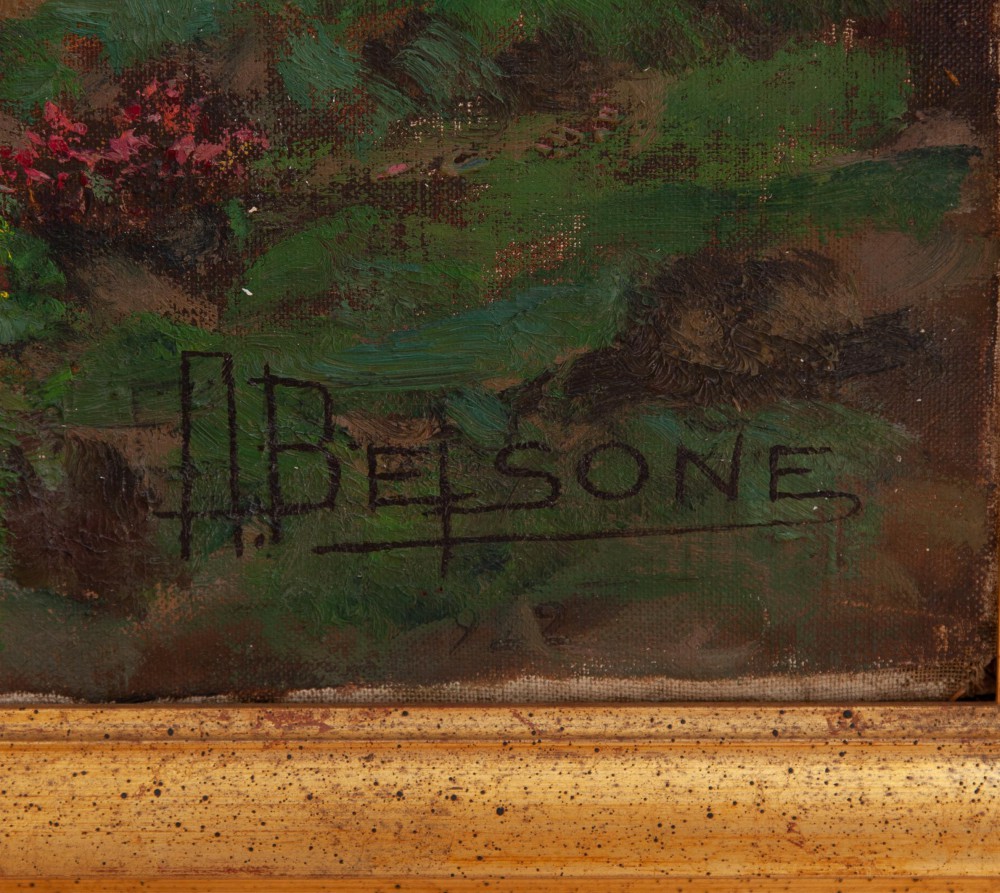 Beisone Alfredo, la vocazione persistente fu la pittura che scelse dopo gli studi classici lasciando da parte la facoltà di Farmacia. Ha vent' anni quando guarda da vicino Lorenzo Delleani (Pollone Biella 1840 — Torino 1908) e subisce il fascino di Andrea Tavernier (Torino 1858 — Grottaferrata Roma 1932) che segue a Venezia, a Firenze, a Roma, in Liguria e in Francia. La guerra 1915-18 lo chiama volontario alpino nel Battaglione di Pinerolo e lo porta in Cadore dove si distingue in varie operazioni riconosciute con medaglie al valore militare. Negli anni Trenta ha una carica pubblica al Comune di Pinerolo e viene insignito della Croce di Cavaliere della Corona (1931). In queste date si snoda il suo curriculum artistico che pubblichiamo a parte, così come a parte vengono trascritte alcune testimonianze critiche, nonché di vita, come la visita al suo studio, visto da chi, contemporaneo a lui, realmente vi entrò, guardò le pitture, sentì il profumo dei colori ad olio del grande quadro su tela, scorse le fresche pennellate sulle tavolette di legno, queste ultime amiche inseparabili delle uscite "en plein air" in città, in campagna, in montagna, in riva al mare. Chi entrava nello studio scopriva anche pochi ma interessanti ritratti, volti femminili, figure animatrici di momenti di vita raccolta ed operosa. Anche "il sacro" vi faceva capolino, ma raramente. Alfredo Beisone era innanzitutto "paesaggista nell’anima", come abbiamo voluto sottolineare in apertura di questa monografia le cui pagine tentano di dare una lettura esaustiva delle tematiche e del linguaggio pittorico. Come non vedere in Beisone un innamorato della sua terra? Nel capitolo dedicato alla città e agli immediati dintorni, egli subito dilata il suo animo abbracciando cielo, montagne, colline e prati, in un profilo di case e campanili, con l’uomo, il contadino al pascolo, in primo piano. Paesaggio in piena luce che tradurrà altre volte al declinare del sole creando suggestioni intime.