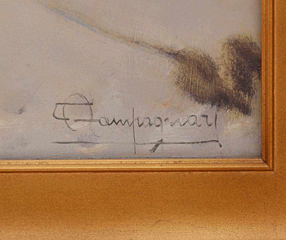 Campagnari Ottorino, artista paesaggista dello stile tardo ottocentesco , attivo già da giovanissimo ,predilesse soggetto montano e vigorose mareggiate della costa ligure soprattutto presso Varigotti dove era solito soggiornate. Fu presente a numerose rassegne nazionali tra le quali la Promotrice di belle arti di Torino del 1942. Tenne personali, sia in Italia che all’estero a numerose collettive. Composizioni che risultano piacevoli, aspetti di una capacità espressiva, certamente di non minore interesse rispetto ai paesaggi, sostenuta da una solida, attenta preparazione che in molti casi gli ha permesso di cogliere la piacevole rispondenza di un interno con figura ed il mondo, semplice, profondamente vero che lo circonda. Un’impostazione che ha mantenuto inalterata nel tempo la sua struttura, la sua suggestiva adesione alle montagne care a Maggi, a Musso, a Rolla e ad Angelo Abrate. Risulta pertanto chiaro che in questo artista il dialogo con la natura mantiene inalterati i presupposti con la genuinità dell’immagine, con la fedeltà all’ambiente, ‘con la coerente testimonianza di un dipingere che si fa apprezzare dal pubblico per il costante amore per l’antica « veduta », per il cordiale « intento rappresentativo », per quella sua raffigurazione gradevole, pronta a recepire il senso ultimo di una tradizione paesistica che sembra resistere ad ogni rivolgimento estetico, che appartiene indissolubilmente alla cultura figurativa piemontese dell’ottocento e del primo novecento. Una tradizione e una cultura artistica che sono i segni indelebili del nostro vivere, del nostro procedere fra ansie e violenze e che pur nell’evoluzione del gusto e del costume, hanno una decisiva influenza presso gli amanti di un « genere » mai definitivamente tramontato, ma inteso quale richiamo sentito ed avvertito in alternativa alle pressanti, soffocanti, talvolta drammatiche giornate della nostra inquieta esistenza. Ottorino Campagnari ha raggiunto perciò una propria, inconfondibile linea espressiva, una propria capacità nel rendere lieve ed impalpabile il candido manto della neve, nel recuperare gli ultimi elementi di un paesaggio che si trasforma e muta con il trascorrere delle stagioni.