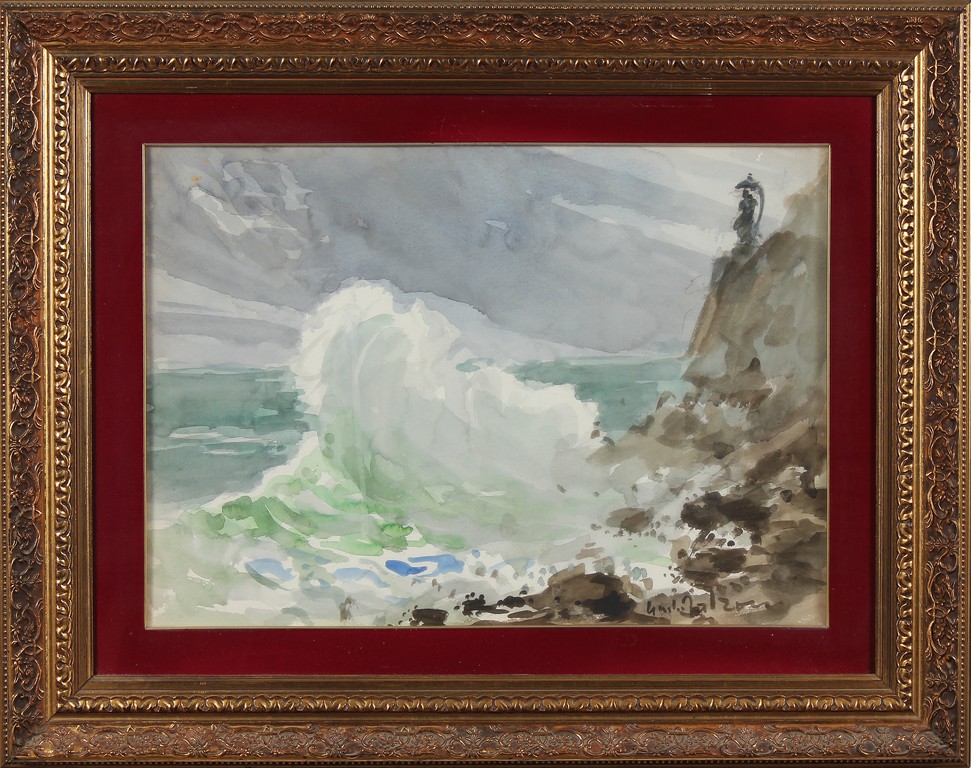FALZONI GIULIO (1900 - 1987) Mareggiata. Acquerello . Cm 70,00 x 50,00. Firma in basso a destra. Cornice presente