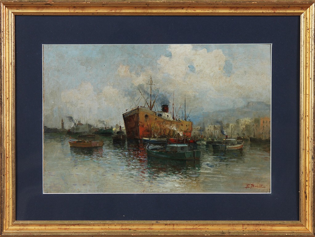 BRIANTE EZELINO (1901 - 1971) Porto con barche. Olio su cartone pressato. Cm 49,50 x 33,00. Firma in basso a destra. Cornice presente