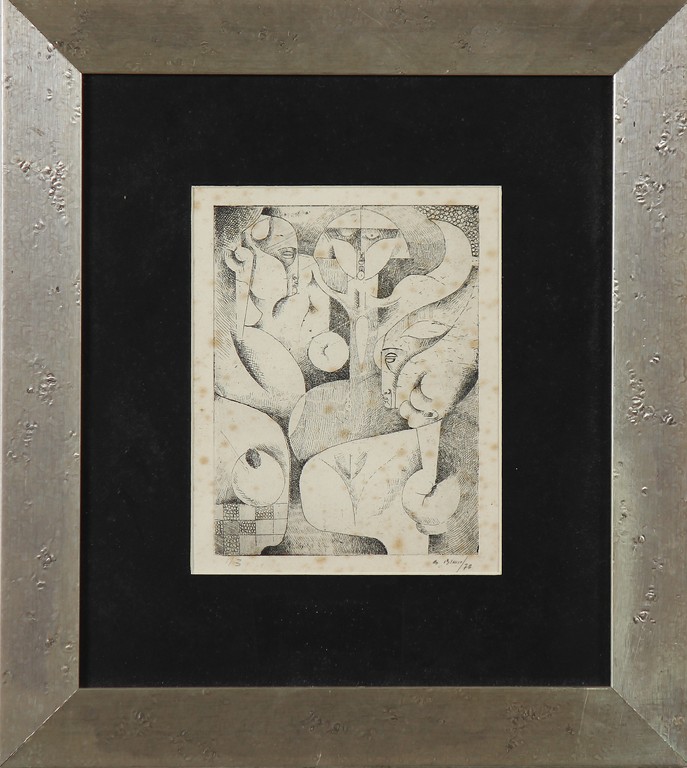 ANONIMO Composizione. 1976. Incisione. Cm 24,50 x 35,00. Tir.1/3. Firma e data a matita in basso a destra. Presenti fioriture. Cornice presente