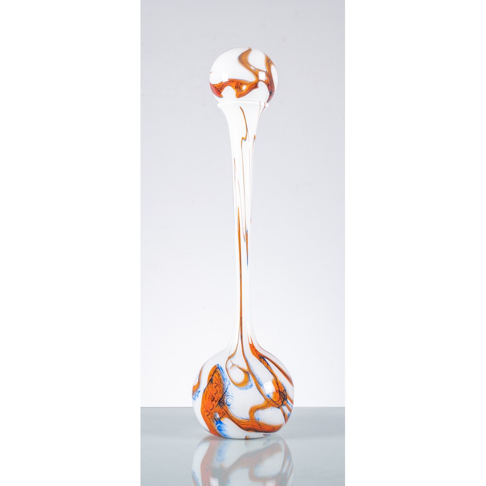 Grande bottiglia in vetro lattimo decorata con motivi astratti policromi, corpo sferico con lungo collo a tromba tappo globulare.