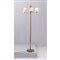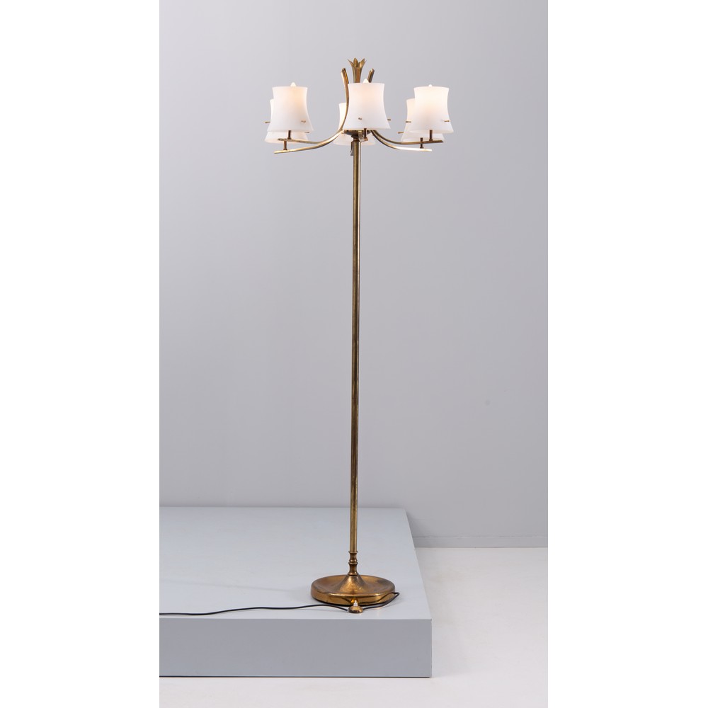 Lampada da terra a sei luci, struttura in metallo e ottone, bracci curvati e diffusori in vetro opalino, base circolare in marmo.