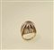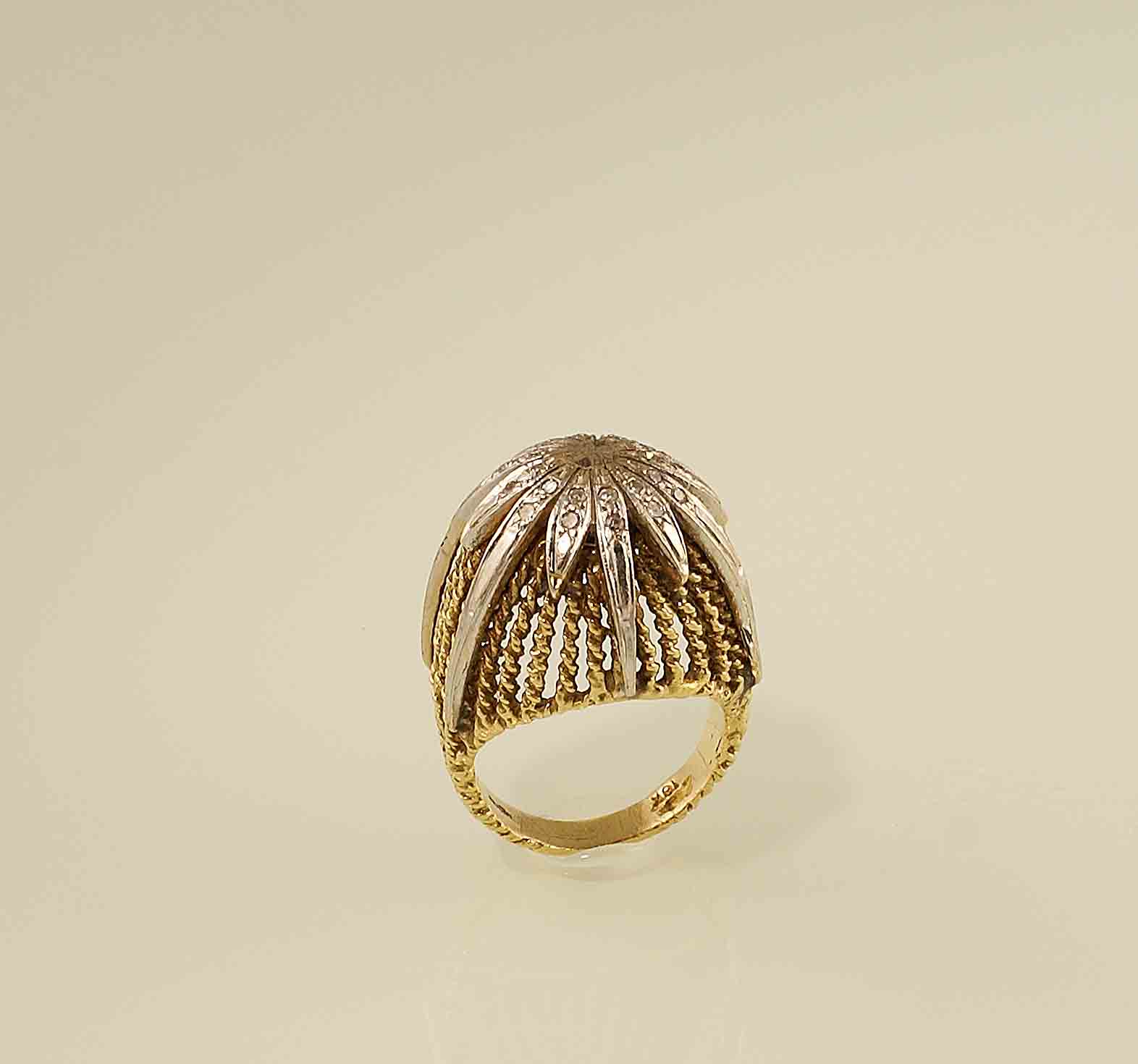 Anello a trombino in oro giallo e bianco 18kt con incastonati diamanti taglio brillante per 0,35 punti circa, anni 50/60, gr. 13,1.