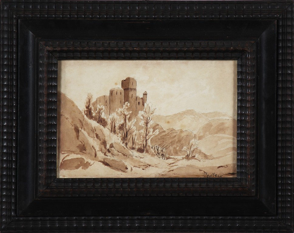 Lotto 165 | ARTISTA DEL XIX SECOLO Paesaggio con castello. Tempera su cartoncino. Cm...