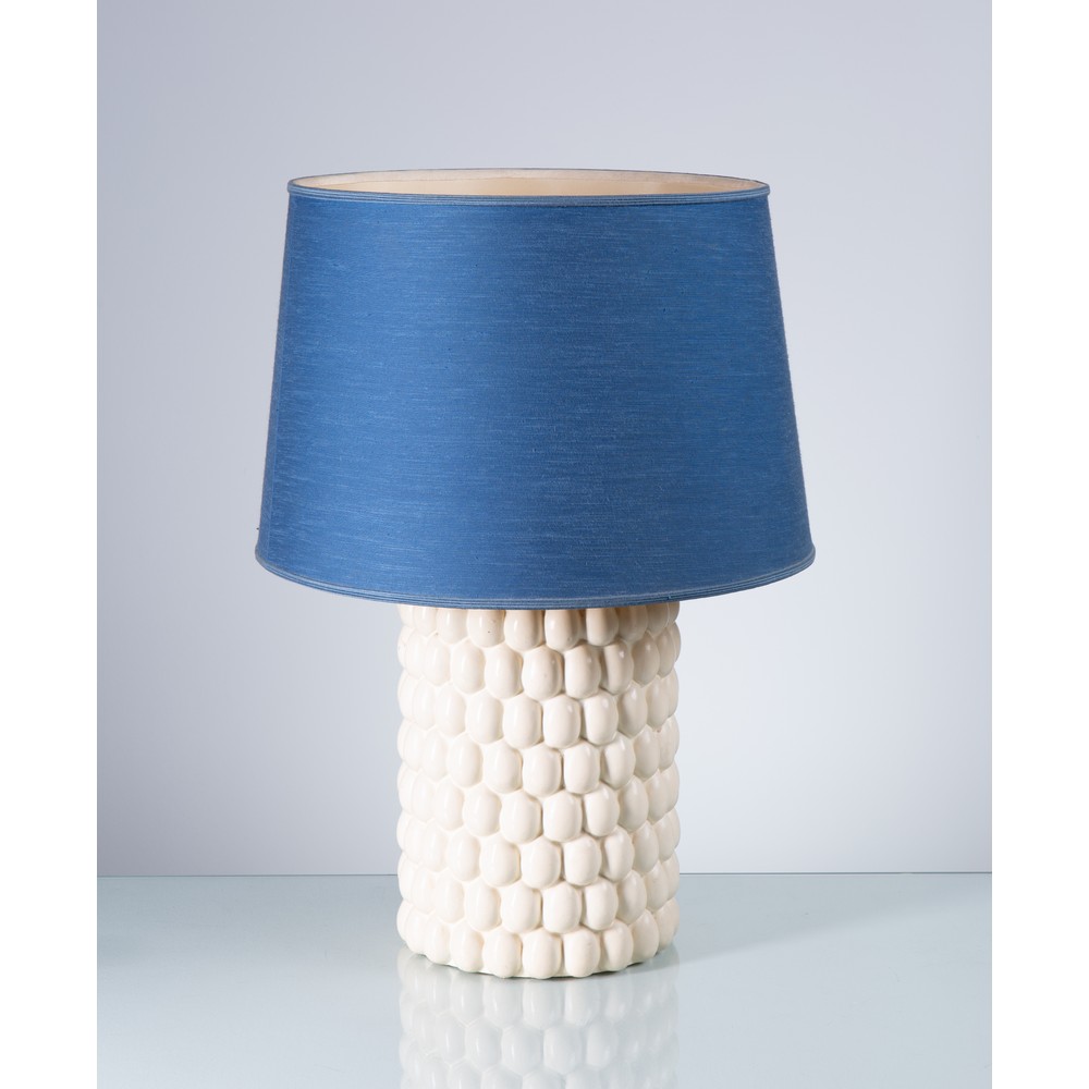 Lampada da tavolo ad una luce in ceramica smaltata bianca, corpo cilindrico lavorato ad ovuli.