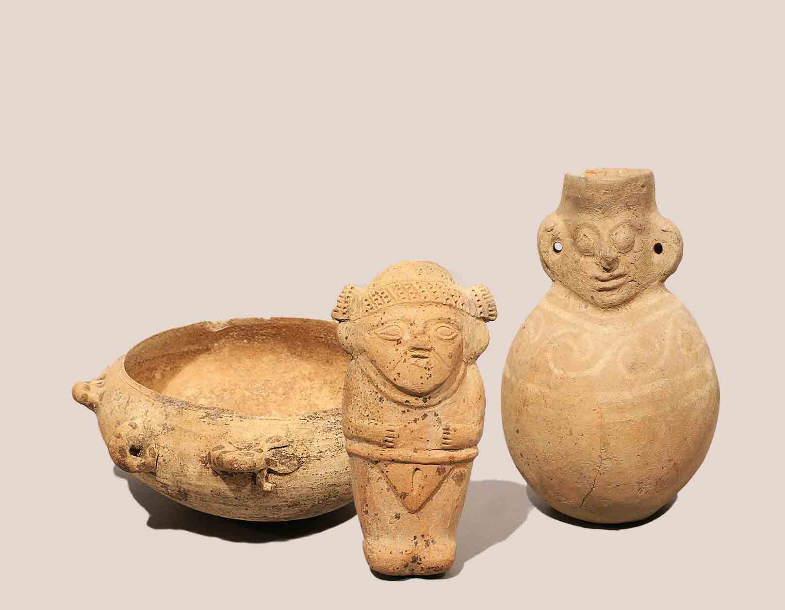 Arte Precolombiana, XV secolo, lotto composto da tre oggetti in terracotta, fogge e misure diverse.